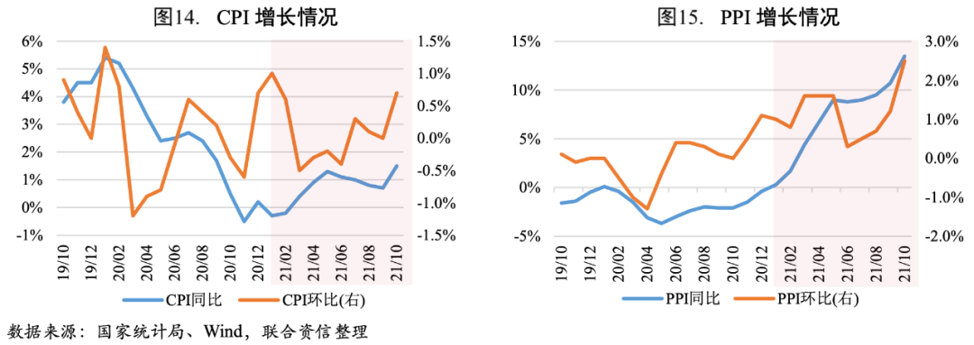 受國際輸入性因素疊加國內主要能源和原材料供應偏緊影響,10月PPI漲幅再次擴大。10月PPI同比增幅較9月擴大2.80個百分點至13.50%,創歷史最高值。其中,生產資料價格上漲17.90%,漲幅擴大3.70個百分點,主要是受國際價格上漲疊加國內主要能源和原材料供應偏緊影響;生活資料價格上漲0.60%,漲幅擴大0.20個百分點。從環比看,PPI漲幅較9月擴大1.30個百分點至2.50%。近期煤炭、鋼材等價格下行,疊加國內大宗商品價格控制政策、北方建筑工業停工導致黑色金屬需求減弱,或將帶動11月PPI下行,PPI-CPI剪刀差收窄,中下游企業盈利情況或將好轉。