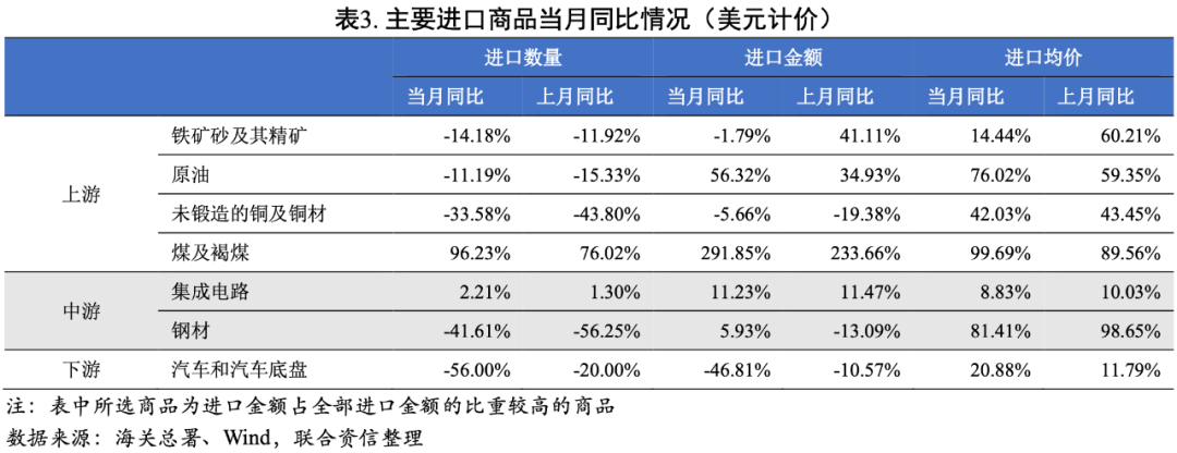 進口方面,從主要進口商品來看,煤炭因為冬季供暖需求量較大,進口數量大幅上升;集成電路由于全球供應鏈短缺導致進口數量增速維持低位;價格上漲疊加國內需求減弱導致鐵礦砂、原油、銅、鋼材以及汽車的進口數量均同比減少。年內能耗雙控壓力仍然較大,國內工業生產承壓,導致對海外原料的需求下降,同時疊加疫情反復對消費的制約,預計進口數量或將繼續下降。