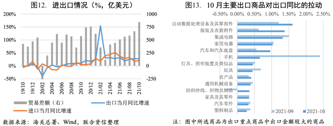 2021年10月我國貨物進出口總額5159.03億美元,同比增長24.30%,增速仍然較高;但環比(-5.30%)有所下降。其中,出口3002.21億美元,同比增長27.10%,仍然維持較高增速,環比小幅下降1.80%,依然表現出較強的韌性,一方面是由于歐美作為主要需求國,產需缺口依然較大,另一方面出口替代效應導致我國出口增加。進口2156.80億美元,同比增長20.60%,主要是價格上漲和去年基數(較低)因素導致;環比下降9.70%,符合往年下行規律。整體看,內需對進口的支撐作用較弱。貿易順差845.40億美元,創歷史最高值。2021年前10個月貿易順差累計5106.35億美元,已接近去年全年水平,今年順差規?;驅摎v史最高,對經濟的拉動作用或將有所提升。