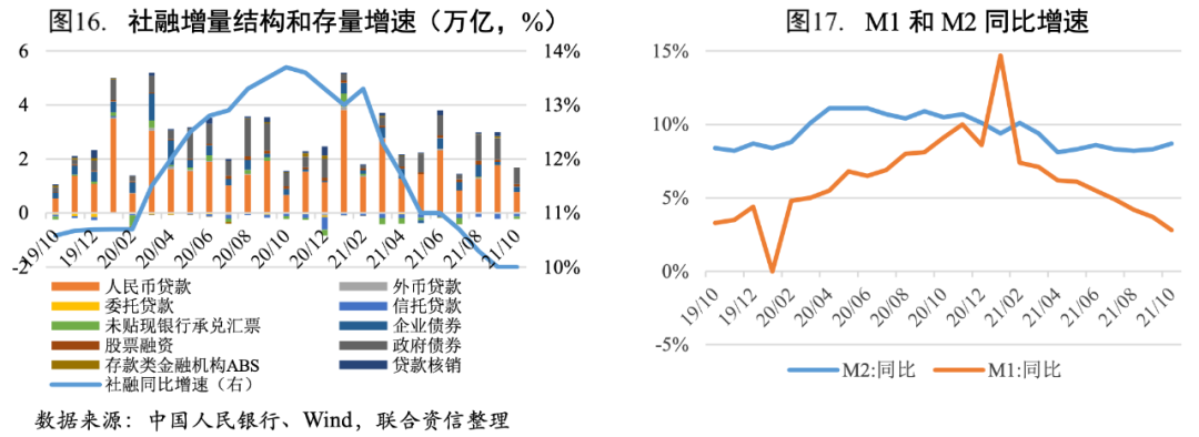 社融存量同比增速與上月持平,人民幣貸款和政府債券融資是主要支撐。2021年10月新增社融1.59萬億元,同比多增1971億元,三個月以來首次轉正;社融存量增速為10%,與9月持平。從社融結構來看,10月新增人民幣貸款和政府債券融資同比分別多增1089億元、1236億元,是社融的主要支撐項;新增委托、信托貸款和未貼現銀行承兌匯票共-2120億元,非標融資規模持續萎縮;其他分項同比變化不大。在政府債發行與上年錯期的影響下,疊加房企融資政策邊際松動,以及9月底央行宣布年內新增的3000億小微再貸款額度逐步落地,對企業貸款也會形成一定支撐,預計11、12月社融增速將會有所回升。