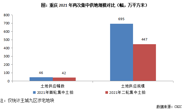 從土地供應規模上來看,重慶(僅考慮主城九區)二輪集中土拍供應宅地較首輪明顯減少,涉及42宗宅地,總供應建面僅447萬平方米,較首輪總供應規模減少了36%;分區域來看,北碚區、沙坪壩區和九龍坡區等環線外區域土地供應比較集中,分別有9、8、8宗,南岸區、渝北區、巴南區、江北等區域供地相對較少,均不足5宗。