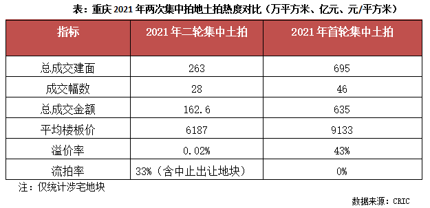 整體來看,在土拍全面升級的影響下,首輪土拍熱度最高的重慶第二次集中土拍市場也急速降溫,在提前中止了9宗地塊后,還流拍了5宗地,流拍率高達33%,同時整體溢價率也由首輪的43%降至0.02%;28宗成功出讓地塊中僅1宗溢價成交,其余地塊均底價成交,市場熱度降至“冰點”。
