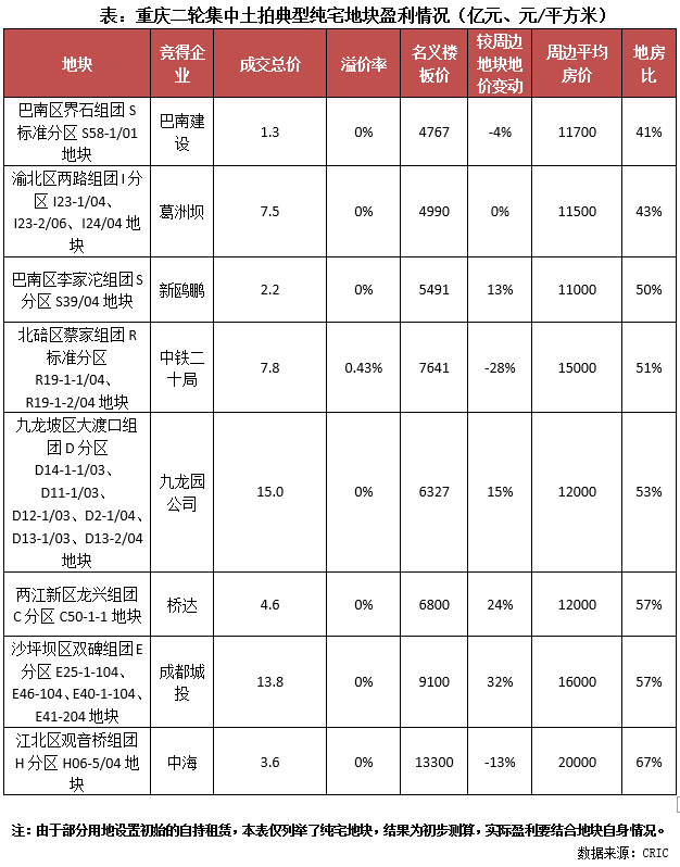 而就盈利情況來看,平均地房比為0.52(不考慮含自持租賃的地塊,下同),較首輪明顯提升,尤其是巴南、渝北的一些地塊,地房比低至0.4,典型如巴南區界石組團S標準分區S58-1/01地塊,樓面價僅有4767元/平方米,這一價格較萬科在周邊拿下的同類地塊樓板價要低4%(該地在首輪集中出讓,樓板價4975元/平方米),按照周邊在售項目平均銷售價11700元/平方米來測算,地房比低至0.41,房地差近7000元/平方米,盈利空間十分可觀。即使是本場土拍中唯一溢價成交的北碚區蔡家地塊(樓板價7641元/平方米),按照周邊在售均價15000元/平方米來測算的話,地房比也僅有51%,也能保持良好的盈利。