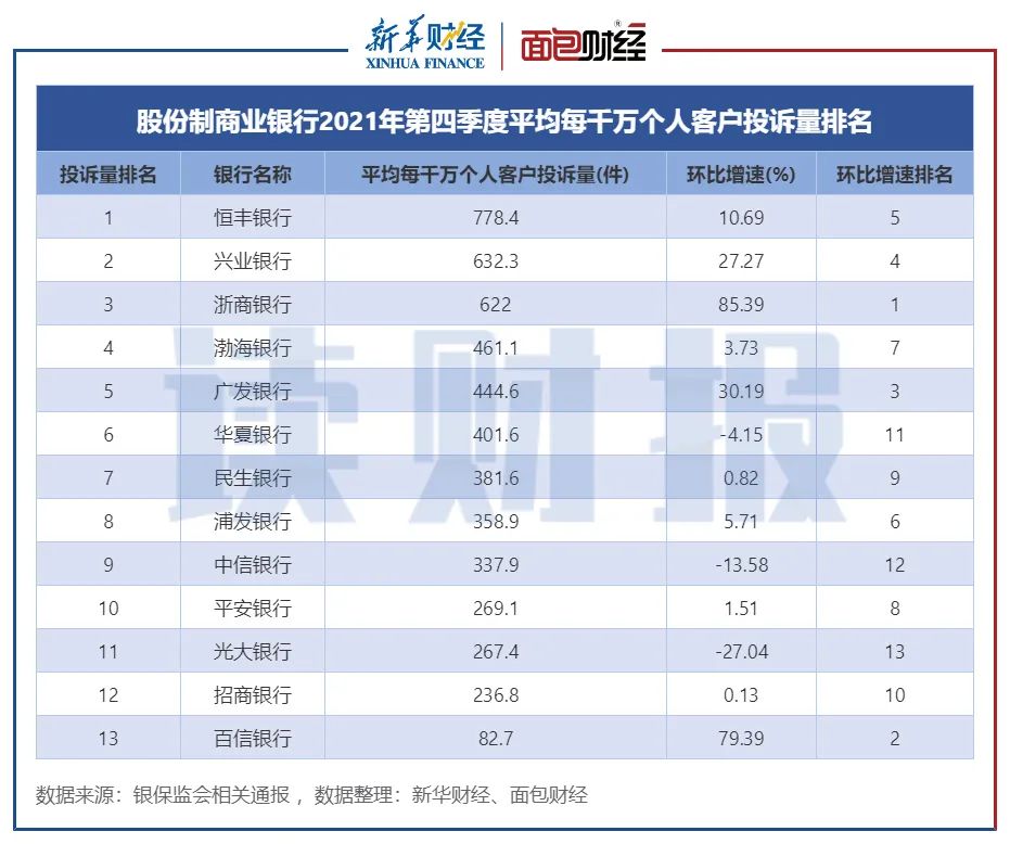 浙商銀行投訴量環比上季度增長85.4%,增速排名第一;百信銀行環比增長79.6%,排名第二;廣發銀行和興業銀行環比分別增長30.2%和27.3%,分列第三和第四位。