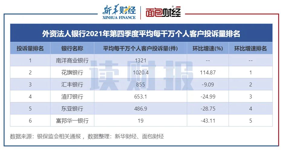 南洋商業銀行2021年第四季度平均每千萬客戶投訴量位居外資行首位,達到1321件。