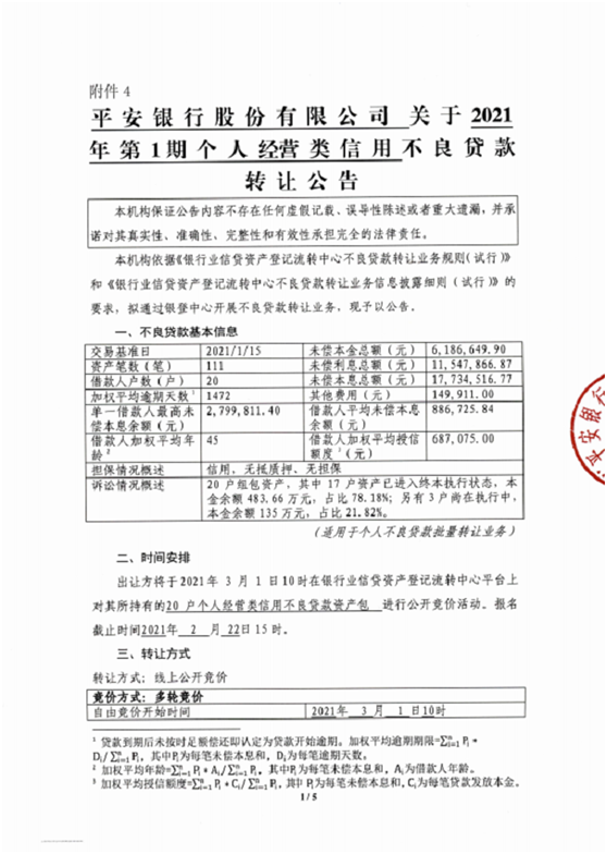 平安銀行首期轉讓的標的即是該行1月25日發布的《擬轉讓簡介》標的。從轉讓公告中可以看出:該批標的為個人經營類信用不良貸款,共20戶,其中17戶已終本,3戶執行中,逾期天數(按未嘗本息總額加權平均)1472天。未嘗本金總額約619萬元,未嘗利息總額約1155萬元,未嘗本息總額約1773萬元,起始價100萬元,加價幅度3萬元。