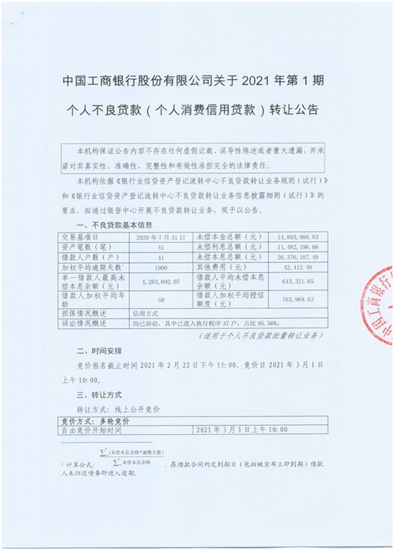 2月8日,平安銀行和工商銀行分別在銀登網上發布了其首個個人不良貸款轉讓公告。兩家銀行不約而同的選在了3月1日采用多輪競價的方式進行競價轉讓,并按《信息披露細則》的規定和附件1《不良貸款轉讓公告》模板,在公告中披露了不良貸款基本信息。