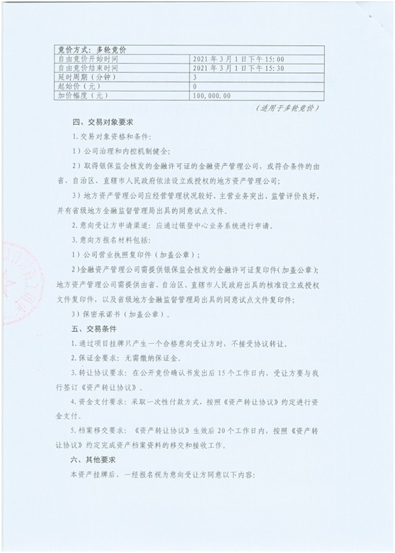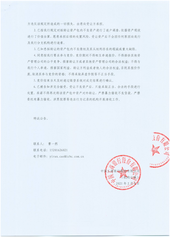 工商銀行第3期轉讓的標的亦為信用卡透支類不良貸款,共31戶(32筆),均未訴訟,逾期天數(按未嘗本息總額加權平均)168天。未嘗本金總額約2825萬元,未嘗利息總額約277萬元,未嘗本息總額約3102萬元,競價起始價0元,加價幅度10萬元。