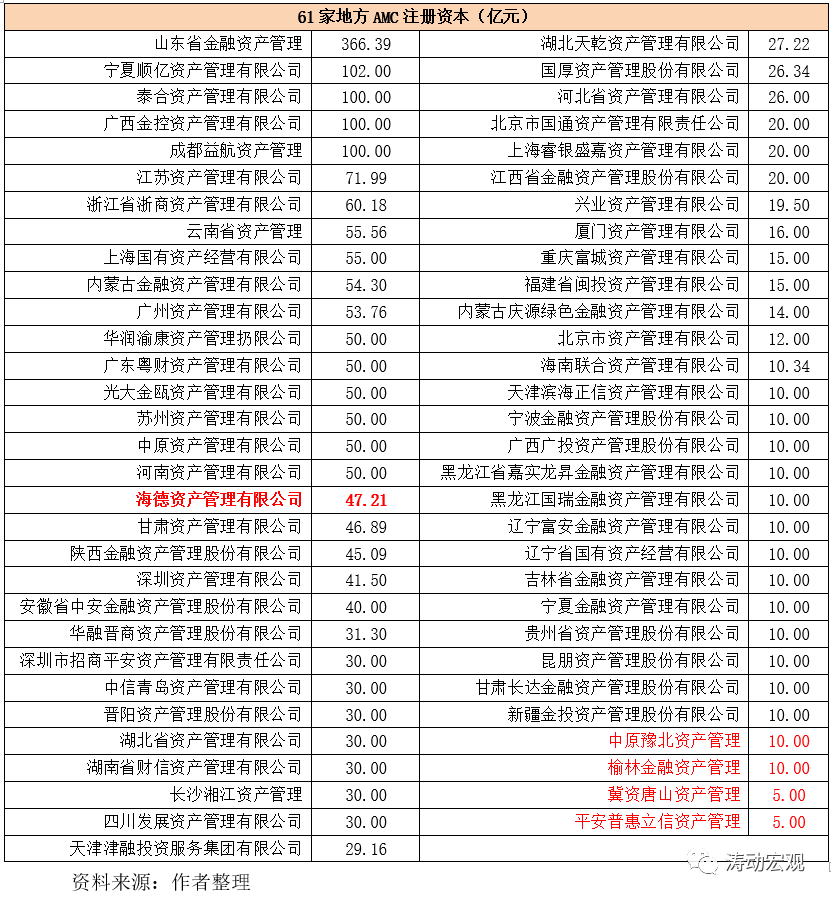 (1)2015年2月28日成立的吉林省金融資產管理因大股東于2020年4月被最高院判決解散。不過2021年2月吉林省盛融資產管理有限公司獲批從事金融企業不良資產批量收購業務,算是填補了吉林省地方AMC的空白。