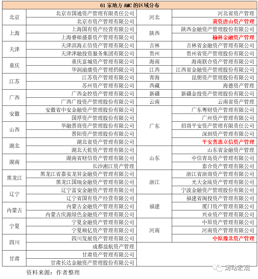 2、除以上56家地方AMC外,我們將一些已成立或處于籌備中但未獲金融監管部門批準的地方AMC也考慮在內,具體看下61家地方AMC的區域分布情況: