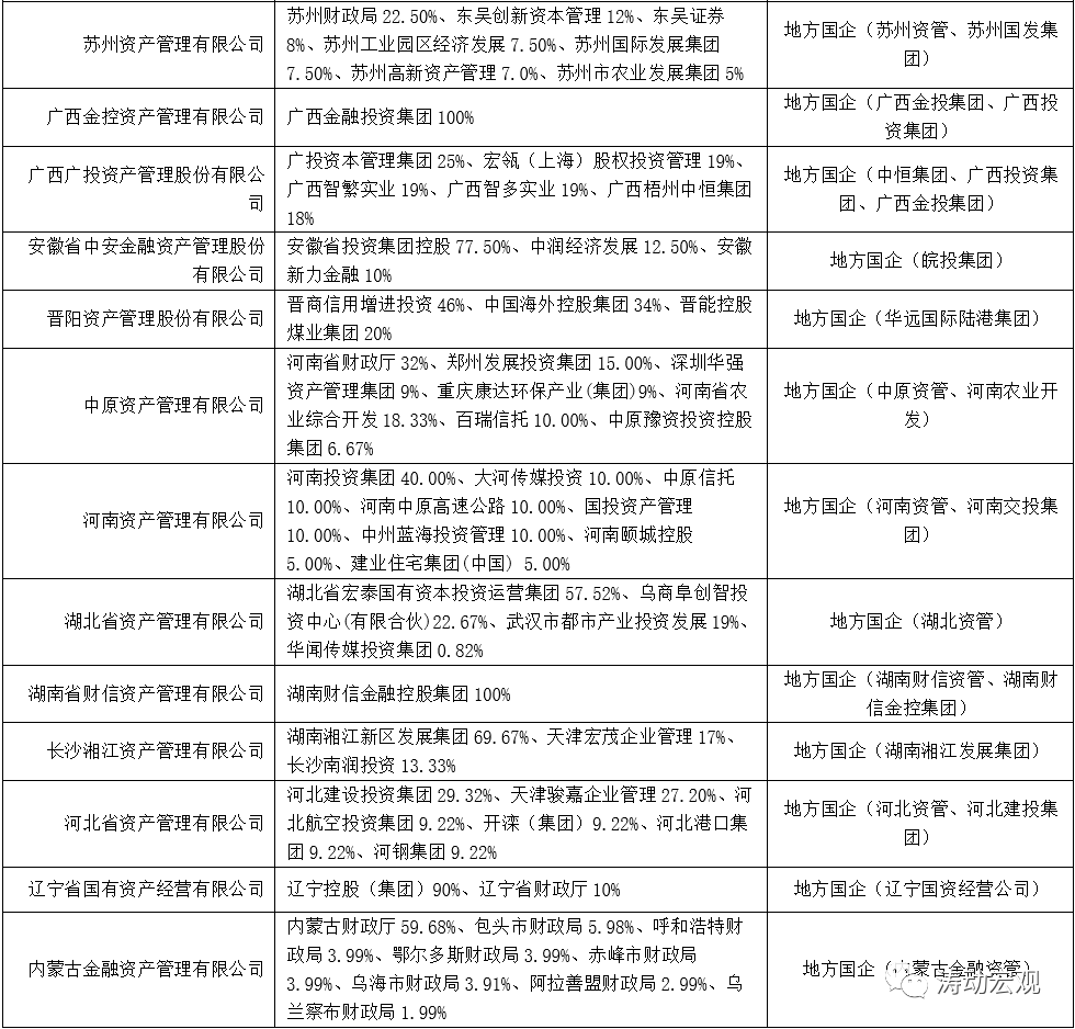 按照控股股東類型、股權結構的不同,61家地方AMC大致可以分為三大類:一是央企類;二是地方國企控股類;三是民企類。部分代表性機構可見下表: