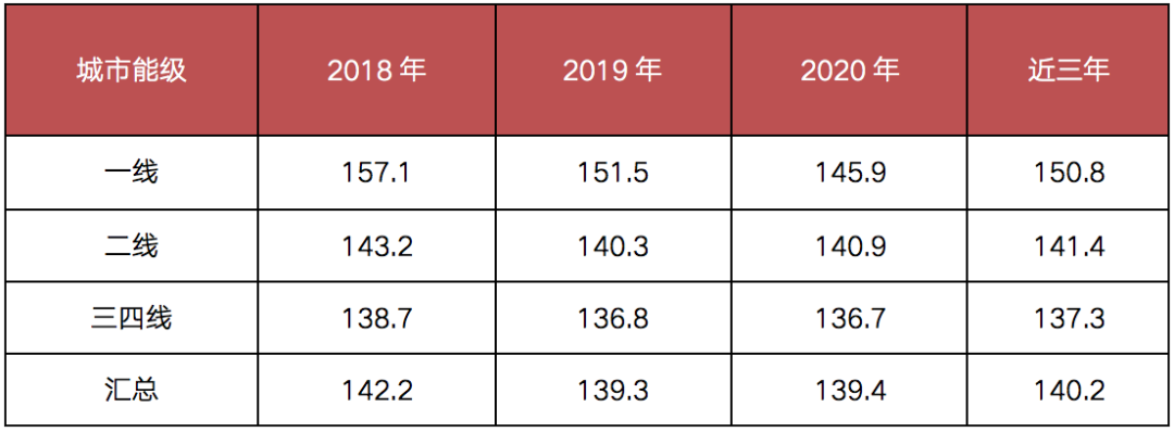 表:各能級城市四房戶型近三年套均面積情況