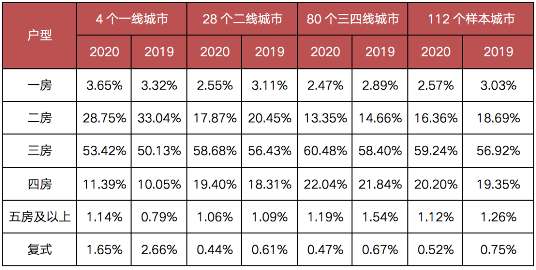 據(jù)112個重點監(jiān)測城市的調(diào)查數(shù)據(jù)顯示,2020年,普通住宅戶型成交方面三房仍是成交主力,成交占比進一步提升至59.24%,較2019年凈增長2.31個百分點;與此同時,四房成交占比穩(wěn)中有升,較2019年凈增長0.85個百分點至20.2%,高于一房和二房戶型之和,這一數(shù)據(jù)顯示改善型住房需求依舊堅挺,且從其上升趨勢來看,有較強購買力及市場支撐。
