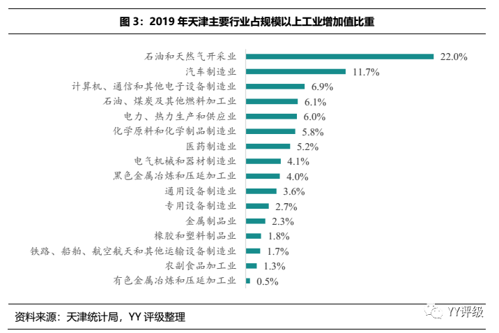 天津是老牌工業城市,而工業產值中的絕大部分比重來自于重工業。在2019年規模以上工業增加值中,石化、鋼鐵、冶金等重工業占比仍然較高。