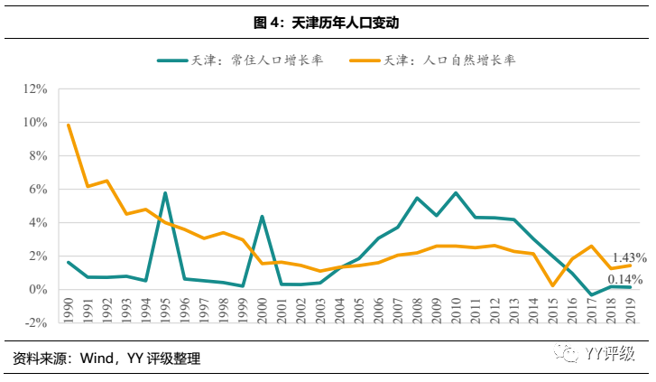 另一個相輔相成的后果是人口流出。天津近年來常住人口增長率下滑至人口自然增長率以下的水平,說明人口正在逐步流出,這其實也反映了區域產業發展不佳,對于人才的吸引力逐步下降,根據中指研究院數據,2019年天津優質寫字樓的整體空置率竟然高達42.6%。雖然2018年天津政府推出了“海河英才計劃”,為戰略性新興產業發展需要,對所需人才落戶進行現金獎勵,但仍然要面臨各城市搶人大戰的激烈競爭。