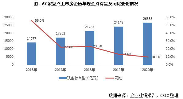 2020年末67家重點上市房企的現金持有量為26585億元,同比增長10.1%,增速較2019年下降3.35個百分點?,F金持有量同比增速由2016年的56.0%的增速下降到2020年的10.1%,呈下降趨勢,且近兩年逐漸下降到一個相對穩定的區間,主要在于隨著政策持續調控,近兩年行業已經進入緩慢增長期,疊加近期三條紅線的調控出臺,短期內現金的增長也相對平穩。