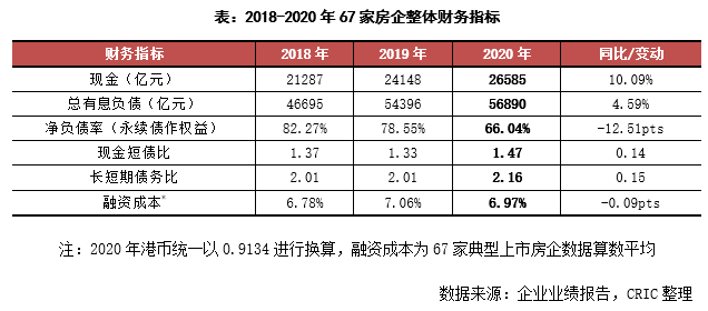 2020年末67家房企的加權凈負債率(永續債作為權益)約為66.04%,同比大幅下降了12.5個百分點,下降幅度是近三年來新高。三條紅線出臺后,由于凈負債率需低于100%的紅線要求,房企積極進行降杠桿,一方面通過出售項目,加大現金回款率等多種方式促進現金增長,現金同比增長了10.1%個百分點;同時,減少負債增加額,總有息債同比漲幅僅為4.6%;最后,通過加大合作,或者實現上市、分拆旗下業務板塊上市的方式,保持較高的權益增長速度,67家房企的總權益同比增長20.1%。在此消彼長的情況下,房企的整體凈負債率得到較大的改善。