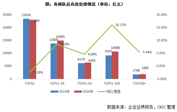 從各梯隊的表現來看,2020年末 TOP10房企的總有息債規模實現負增長,同比下降2.39%至22866億元。除了TOP10以外其余四個梯隊的房企均實現了總有息債的增長, TOP51-100的房企增幅最大,同比增長16.11%至10688億元,而TOP31-50及TOP100+梯隊的房企增速相對較小??梢钥吹剑科笳w的有息債增長較為緩慢且均衡,但各個梯隊的變動有所分化,部分頭部房企主動追求降杠桿,TOP11-30和TOP51-100等規模擴張的房企則增長相對較大,TOP31-50及TOP100+的房企求穩,增長較小。