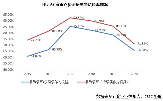 值得注意的是,永續債理論上雖然也能為企業增添權益,改善杠桿,但由于永續債“明股實債”的特性,三條紅線提出后監管層面嚴控房企永續債發行,2020年三條紅線公布之后企業新發行的永續債量約為84億元,占全年22%,2021年至今無企業發行永續債?;诖?,2020年末67家重點房企的永續債存量1429億元,同比減少56億元。永續債作為債務計算的加權凈負債率為71.37%,同比減少14.3個百分點。
