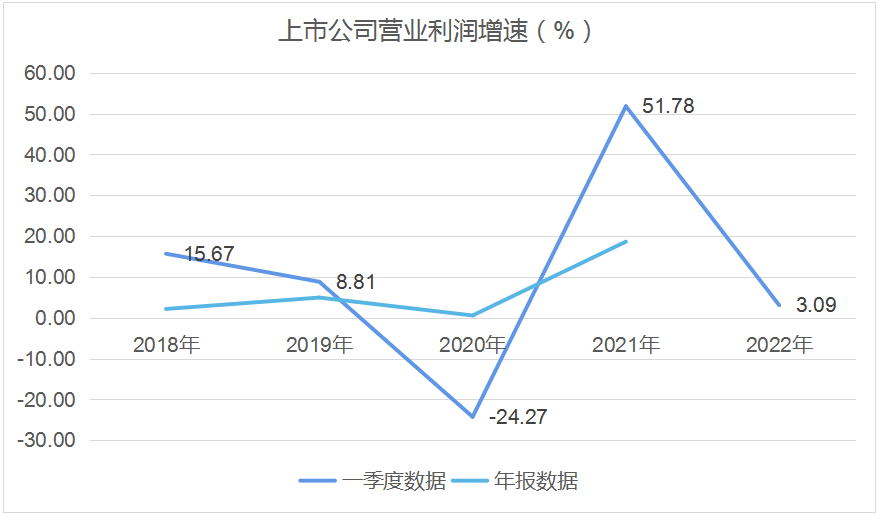 2022年一季度A股公司實現收入164936.38億元,實現凈利潤15157.24億元。A股上市公司一季度收入增速10.97%,與疫情前的增速相當;一季度營業利潤增速3.09%,低于疫情前的水平。