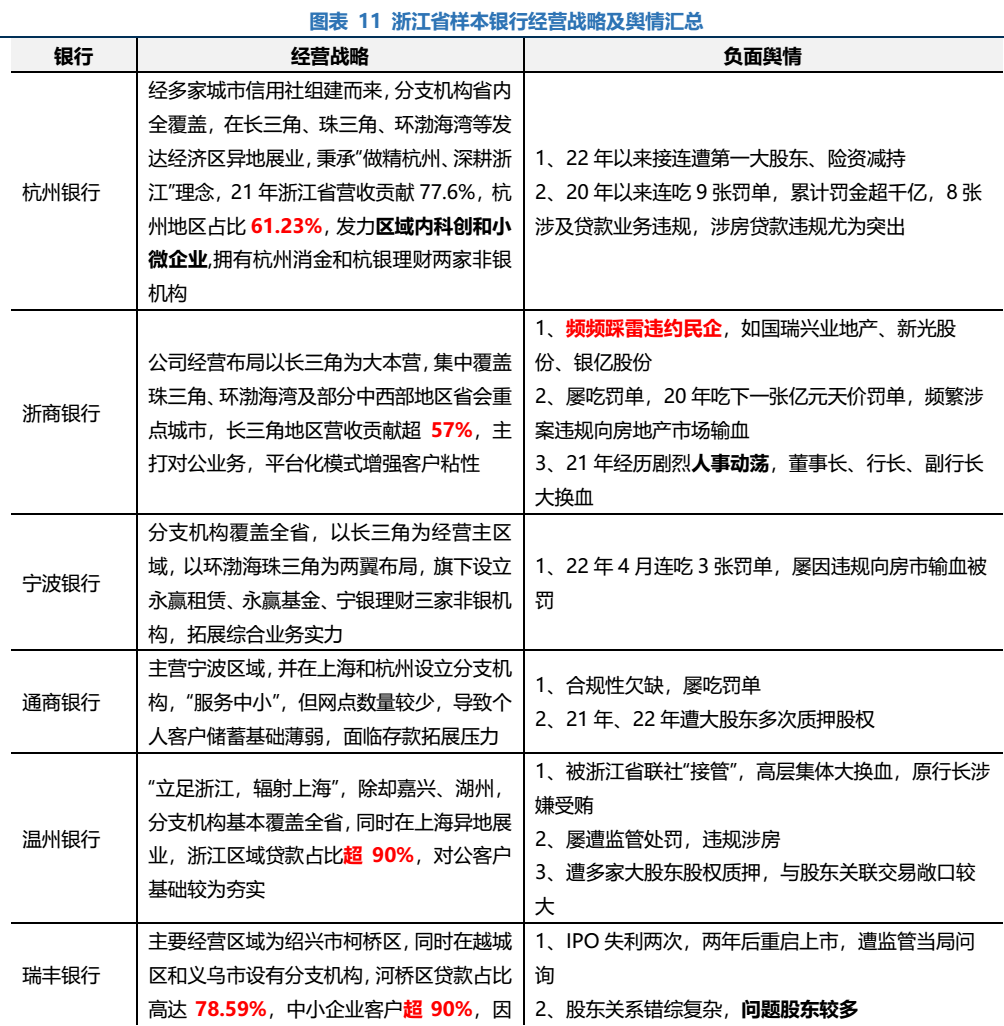 由于浙江的塊狀經(jīng)濟(jì)屬性,樣本行之間表現(xiàn)出差異化特征,上述四個維度分化較大。資產(chǎn)投向方面,有親基建的杭州銀行、有親零售的寧波銀行、亦有親租賃和商務(wù)服務(wù)的通商銀行……但他們都奠基于民營經(jīng)濟(jì),深耕小微客戶。資產(chǎn)質(zhì)量方面,部分銀行不良雖有抬頭傾向,但隨著不良處置力度加大,區(qū)域不良將仍較為可控。盈利能力方面,有盈利翹楚的臺州銀行,有優(yōu)等生寧波銀行,亦有吊車尾的溫州銀行,本地經(jīng)濟(jì)稟賦固然是決定盈利的重要因素,差異化經(jīng)營策略亦是制勝關(guān)鍵。資本充足性方面,樣本行均距監(jiān)管標(biāo)準(zhǔn)有一定安全邊際,高位撥備或能實現(xiàn)區(qū)域跨越周期。