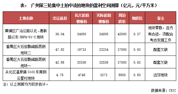 值得注意的是,此次集中供地中有7宗地均為二輪集中出讓中遭遇流拍的地塊,此輪再次掛出,多宗地的起拍門檻有所下調。有4幅地的起拍總價較二輪時下調,降幅都在10%以上,其中白云太和鎮沙亭地塊降幅高達21%,地價顯著下調。番禺利豐地塊和從化江浦地塊雖然起拍總價并未下調,但分別取消了10%回購物業的配建要求和引進產業的要求,實際拿地門檻也較上一輪明顯下降。唯一地塊上漲的地塊位于增城區,該宗地起拍價較二輪掛出時上漲了約4%,但考慮該宗地也取消了配建回購物業的要求,實際起拍樓板價較第二輪也下降了245元/平方米。