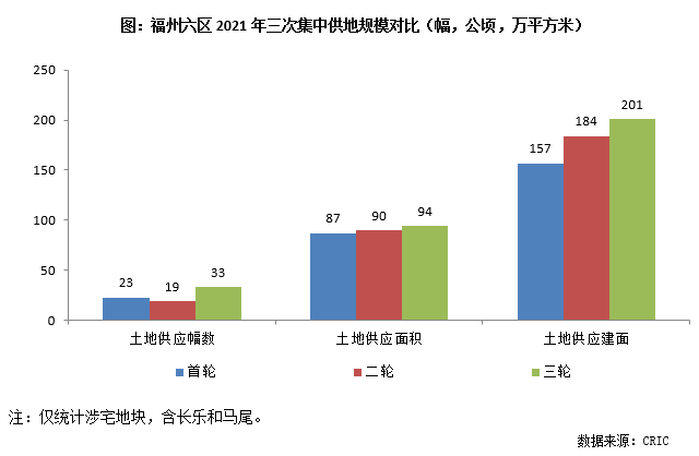 從土地供應規模上來看,福州三輪集中土拍供應宅地33宗,總供應建面201萬平方米,較前兩輪供應規模均有增加,增幅分別為28%和9%,整體來看,三輪土拍供應量還是相對充裕的。