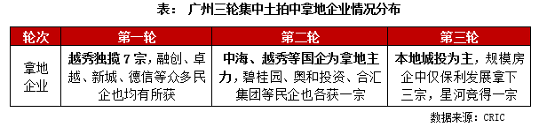 另外,從參拍房企來看,三輪集中土拍較前二輪也發生了極大變化。首輪土拍中保利、萬科、建發、龍湖等龍頭房企頻頻出手,超半數地塊觸發最高限價,最終拿地要憑借運氣,在此影響之下,首輪20宗土地大部分被資金雄厚的大型國企、央企包攬,少量地塊被融信、新城等民企拿下。