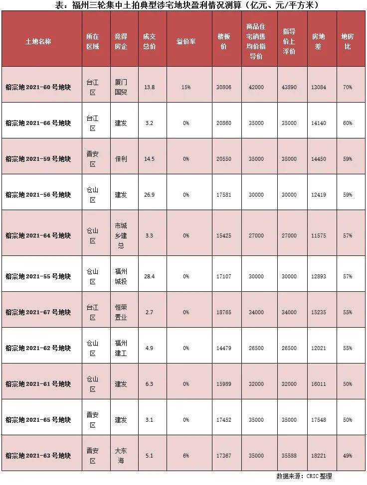 而臺江CBD地塊,由于區位優越、配套完善,且無任何回購配建要求,成為本場土拍熱度最高的地塊(7家房企報名、最高限價+100%首期付款+搖號成交),最終該地被廈門國貿以15%的溢價競得,成交樓面價為30806元/平方米,該地商品住宅銷售指導均價約42000元/平方米(根據溢價率上浮之后的指導價為43890元/平方米),這樣測算下來,地房比為70%,房地差超13000元/平方米,再加上地塊十分稀缺,項目實現盈利基本不成問題。