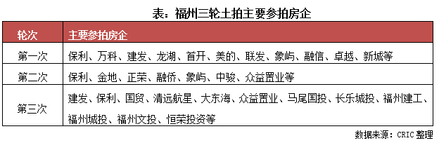 至于二輪集中土拍,福州作為重點城市土拍規則全面升級之后的第一城,由于土地競拍方式發生了一系列調整,最高限價下調至15%,競拍方式全部改為“限地價+搖號”,房企參拍情況也發生極大變化,最終導致大型國企、央企拍地數量明顯減少,僅有保利和金地有所斬獲,拿地主力多為本地民企,譬如融僑、中駿等。