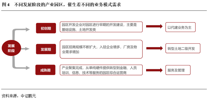 不同發展階段的產業園區,催生著不同的業務模式需求。一般而言,因為地區資源稟賦、經濟發展水平的不同,產業園區存在著初創期、發展期、成熟期等不同的發展階段。對于初創期的園區開發業務,圍繞政府產業規劃、招商引資政策,集中在基礎設施代建、土地開發整理等方面,收益主要源自于政府的代建收入,市場化程度不高。隨著園區入駐企業的增多,廠房、物業需求增加,城投公司逐步拓展至相關產業地產開發業務,如標準廠房、公寓、商業寫字樓等建設,收益主要源自于物業出售、租賃等。最終在產業聚集完成后,園區步入成熟階段,入駐企業的各項金融、信息、技術服務需求增加,城投公司以服務和管理為收益來源的業務將會增長。
