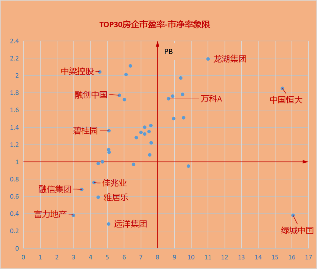 以市凈率1.0、市盈率8.0為坐標(biāo)原點。對TOP30房企進(jìn)行分類。