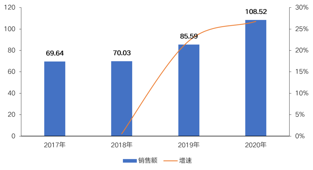 圖:2017-2020年融創(chuàng)廣西區(qū)域銷售規(guī)模與增速(億元)