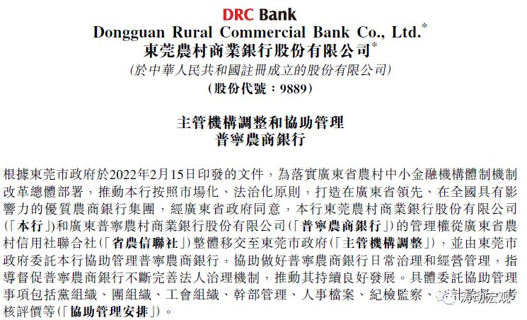 (一)2022年2月16日,港股上市銀行東莞農商行(9889.HK)發布公告明確,根據2022年2月15日東莞市政府印發的文件,東莞農商行與普寧農商行的管理權從廣東省聯社整體移交至東莞市政府,同時東莞市政府委托東莞農商行協助管理普寧農商行。考慮到之前的廣州農商行與深圳農商行亦已脫離廣東省聯社管理,這意味著繼直轄市方案(即單一銀行模式)、浙江方案(即聯合銀行模式)、陜西與寧夏方案(即銀行控股模式)之后,廣東省聯社的方案(即金融服務模式)也基本得以明確,充分體現出“一省一策”的改革思路。