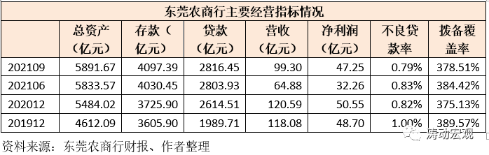 截至2021年9月,東莞農商行的總資產達到5891.67億元,不良貸款率與撥備覆蓋率分別為0.79%與378.51%。目前東莞農商行按總資產排序位居第五大農商行,低于重慶農商行、上海農商行、北京農商行、廣州農商行。