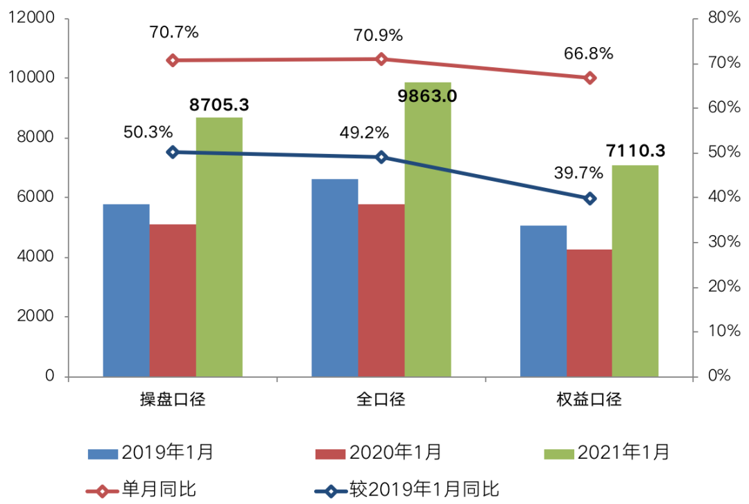 受去年同期正值春節(jié)假日,疊加新冠疫情的爆發(fā)、市場全面停擺影響,整體成交基數(shù)較低,2021年1月百強房企銷售數(shù)據(jù)在去年基數(shù)較低的基礎(chǔ)上出現(xiàn)強勢反彈,整體業(yè)績規(guī)模較去年同期大幅上升70.7%,較2019年同期增長50.3%。