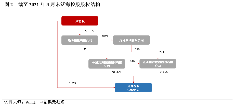 泛海控股,成立于1989年,前身為南海石油深圳開發服務總公司物業發展公司,于1994年在深圳證券交易所上市。截至2021 年3月末,公司控股股東為中國泛海控股集團有限公公司(簡稱“中泛控股”),實際控制人為盧志強,直接和間接持有公司71.23%的股份。