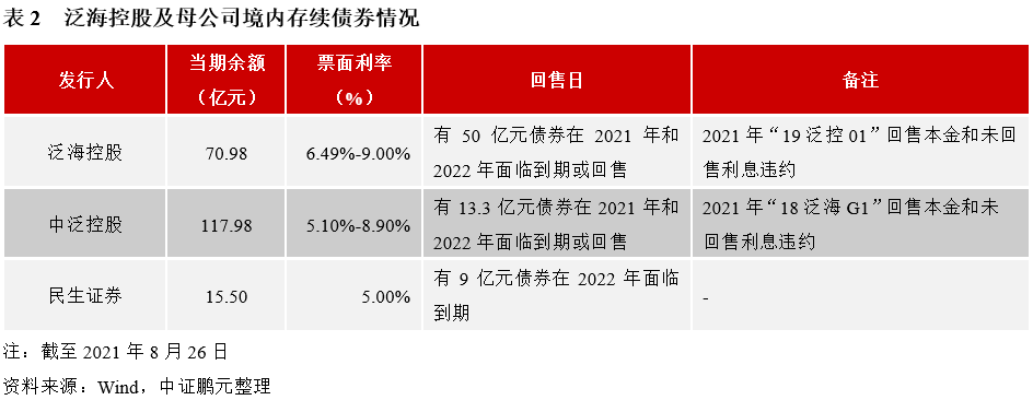 第五,受政策影響,民生系對泛海系支持能力下降。長期以來,民生系是泛海系重要的資金支持方,截至2020年末,泛海系在民生銀行的貸款余額超200億元。但受監管政策和信用風險事件影響,民生系對泛海系的支持力度有所弱化,其中,2021年7月公司控股股東中泛控股持有的民生銀行股份因債務糾紛被司法凍結和拍賣,但隨后與債權人達成協議,撤銷上述拍賣。中泛控股及其關聯方持有民生銀行可行使表決權的股份數合計約30.40億股,占該行總股本的6.94%,其中87.09%已被質押,此次遭司法凍結并拍賣的股份占其持有股份比例為12.79%。此外,根據公開信息,民生信托、民生財富投資管理有限公司和泛海投資集團有限公司基金類資金池產品基本已全線延期兌付,規模超過300億元。