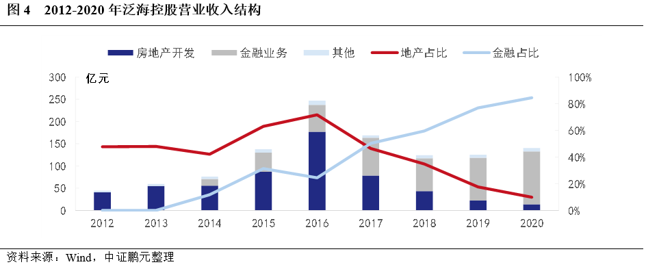 目前,泛海控股房地產業務以住宅產品為主,項目集中在武漢和美國,金融業務主要運營主體為民生證券股份有限公司(簡稱“民生證券”)、中國民生信托有限公司(簡稱“民生信托”)、亞太財產保險有限公司(簡稱“亞太財險”)和中國通海國際金融有限公司(0952.HK,簡稱“中國通海金融”)。房地產板塊受存量項目減少、金融業務增加的影響,收入占比自2016年來呈現明顯下降,于此同時,金融板塊收入占比逐年增加。截至2020年底,地產板塊業務收入占比18%,金融板塊占比77%,收入結構完成調整。2020年1月,經證監會核準,公司行業分類由“房地產”正式變更為“金融業”的子行業“其他金融業”。