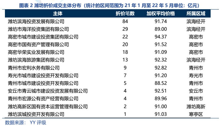 (1)從成交來看,濰坊折價(jià)成交頻繁(2022年5月共11筆折價(jià),金額合計(jì)5.62億元),規(guī)模甚至高于湖南等省份全省,主要集中在濱海經(jīng)開區(qū)和高密市。