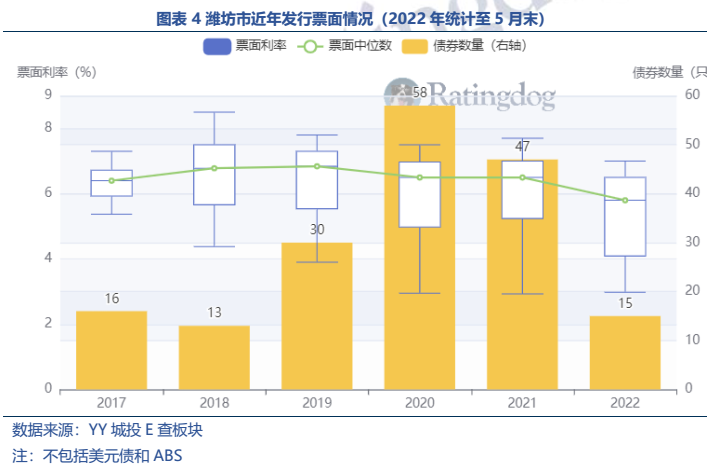 (2)從一級(jí)發(fā)行來看,濰坊整體融資成本偏高,2021年票面中位數(shù)6.5%,明顯高于同期全省票面中位數(shù)4.39%的水平。