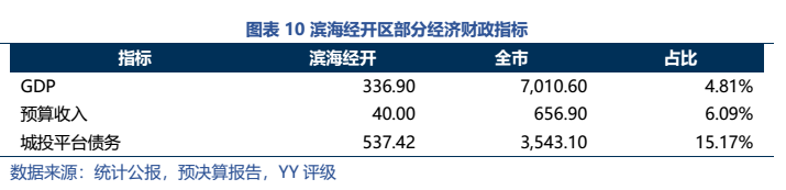 (2)濱海經(jīng)開區(qū)存在過度舉債的情況,21年區(qū)域YY Ratio為1,345%,債務(wù)負(fù)擔(dān)很重,但區(qū)域的發(fā)展?jié)摿Σ粡?qiáng)(10年獲批國家級(jí)開發(fā)區(qū),發(fā)展多年,城投平臺(tái)債務(wù)占全市的15.17%,預(yù)算收入占全市的6.09%;七普人口僅13.67萬人,22年5月房價(jià)4,800元/平方米)。