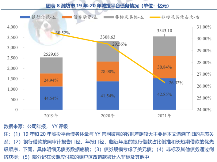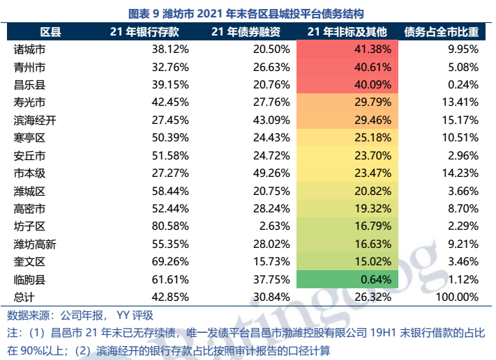 (1)區(qū)域金融資源并不弱(21年末金融機(jī)構(gòu)存款余額1.12萬億元,省內(nèi)排名第三),但非標(biāo)融資占比很高,21年末非標(biāo)融資占26.32%,好在21年已經(jīng)有一定壓降。