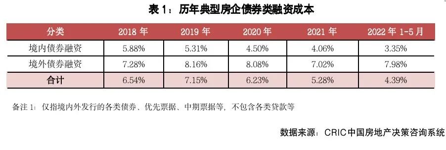 2、融資成本:2022年1-5月100家典型房企新增債券類1融資成本4.39%,較2021年全年下降0.89個百分點,其中境外債券融資成本7.98%,較2021年全年上升0.96個百分點,境內(nèi)債券融資成本3.35%,較2021年全年下降0.71個百分點。單月來看,5月房企融資成本4.81%,環(huán)比上升1.55pct,同比下降0.4pct。其中境內(nèi)融資成本3.73%,環(huán)比上升0.5pct,發(fā)債主體仍是集中在中海、保利發(fā)展、華潤置地等國企央企,但是相較于4月而言發(fā)債企業(yè)的數(shù)量以及債券發(fā)行的規(guī)模均有所減少;境外融資成本10.38%,環(huán)比大幅提升了6.58pct,主要是因為上個月僅有遠洋集團發(fā)行了一筆成本較低的綠色債券,而本月由于中梁和大唐因為交換要約而發(fā)行了3筆優(yōu)先票據(jù),融資成本都相對較高。
