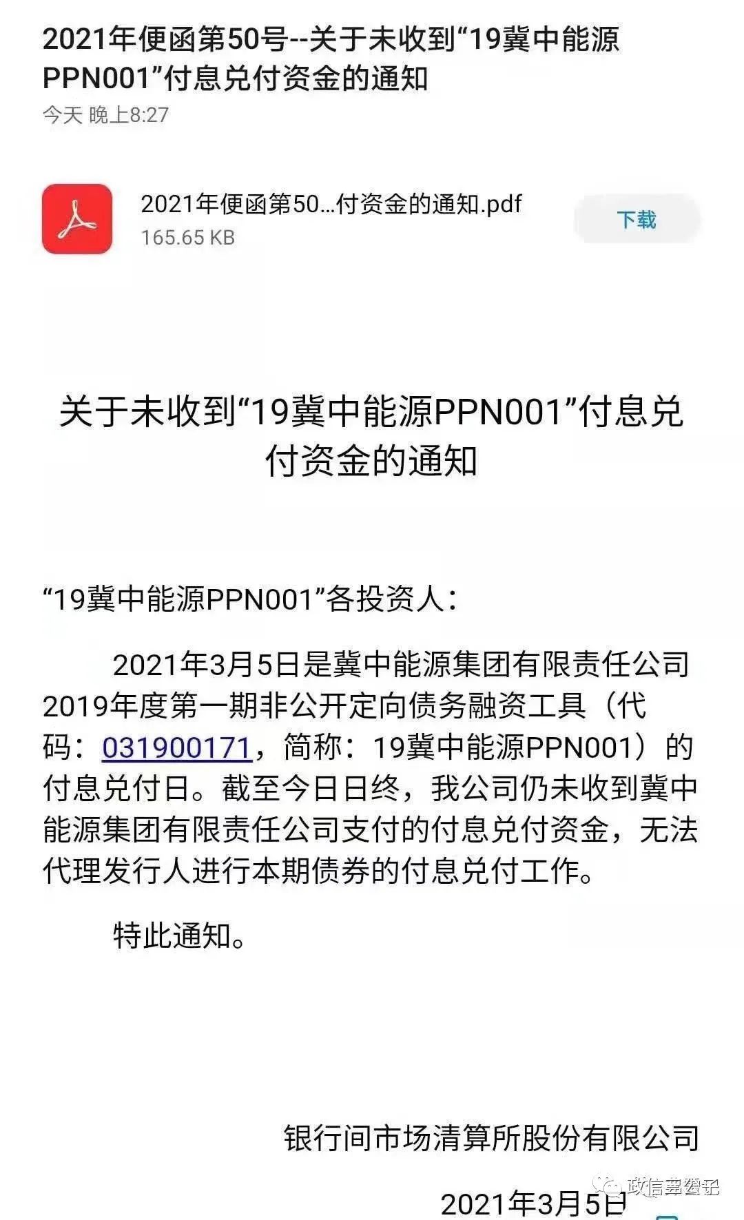 關于未收到“19冀中能源PPN001”【付息】兌付資金的通知。
