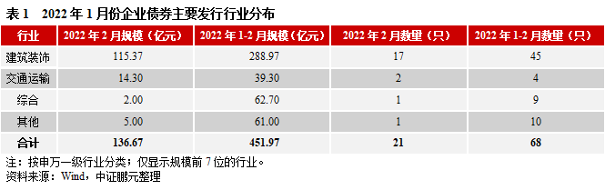 2022年2月,企業債券發行人主要分布在建筑裝飾、綜合等行業。其中,建筑裝飾的發行規模占比為84%,為近一年峰值,其次,交通運輸行業發行規模占比10%。本月企業債發行行業集中度高。綜合2022年1-2月看,建筑裝飾發行規模占比64%,遠高于其他行業。