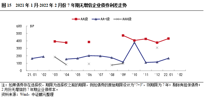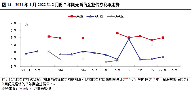 2022年2月,企業債券最高發行利率為7.80%,較上月下行20BP;最低發行利率為2.70%,較上月下行24BP。從債券級別來看,與上月相比,AA級和AA+級企業債平均發行利均上行,發行利差均擴大,其中AA級利率上行96BP,利差擴大103BP,幅度最大;AAA級企業債平均發行利率下行32BP,利差收窄40BP。