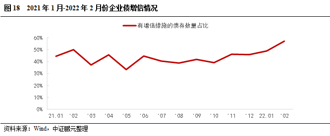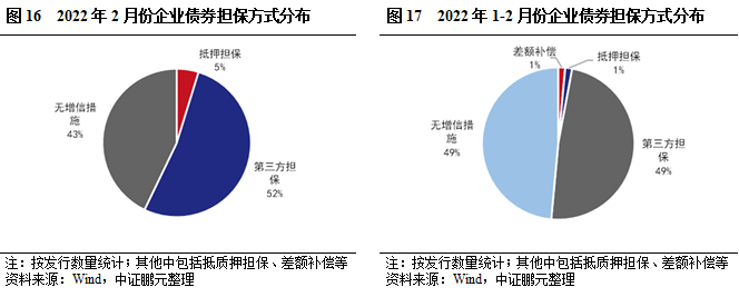 2022年2月,企業債有擔保的債券共計12只,數量占比57%,較上月上升8個百分點,主要是AA+級主體增信比例上升,企業債增信比例持續上升。分主體級別看,AA級主體選擇增信發行的債券比重為82%,較上月上升9個百分點;AA+級主體選擇增信發行的債券比重為25%,與上月持平。本月無AA-級主體發行。綜合2022年1-2月看,有擔保債券共計34只,數量占比51%,較上年同期上升4.8個百分點。