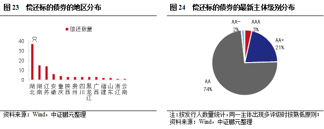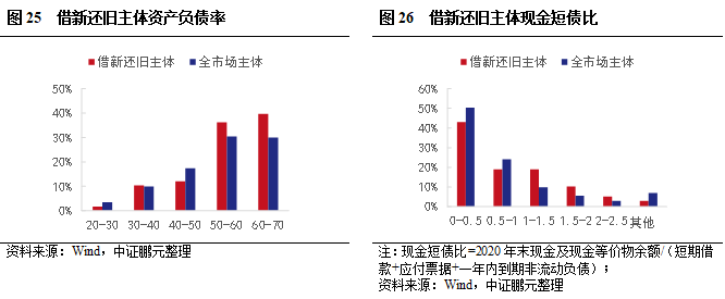 和全市場企業債相比,借新還舊企業債主體資產負債率偏高,現金短債比和短期債務占比表現相對較好,但短期償債能力依然較弱。從地區看,存量主體較高的江浙地區借新還舊較少,湖北和湖南相對較多,借新還舊主體省內占比分別為19%和9%。