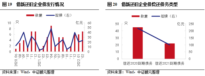 2022年2月,借新還舊企業債發行7只,規模23.37億元,位于單月高位。截至2022年2月,借新還舊企業債共發行67只,發行規模合計318.36億元。其中,2020-2022年分別發行121.39億元、161.60億元、35.37億元。從償還債務類型看,償還2020年到期債券的有45只,發行規模218.19億元,償還2021年到期債券的有22只,發行規模100.17億元。結合發行與償還來看,存在一定時間差,與申報時間有一定關系,若債券發行時,募集資金擬償還債券已用其他資金償還,則可以置換此部分資金。例如,2021年發行的借新還舊債券中,69.7%是用于償還2020年到期債券,2022年已發行的借新還舊債券均用于償還2021年到期債券本息。